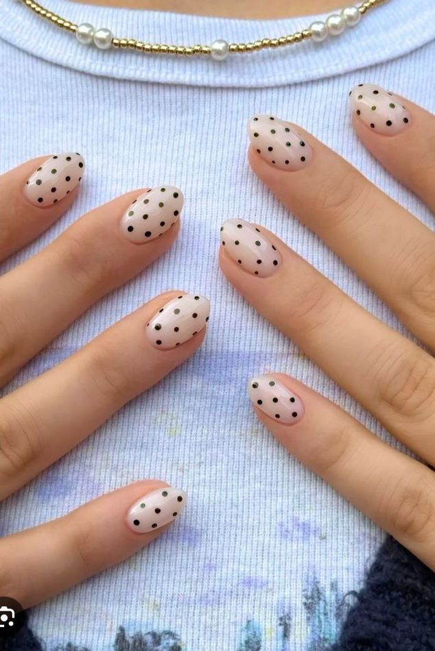 A timeless and cute press-on nail set featuring a soft nude base with tiny black polka dots.